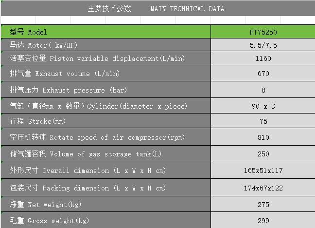 標題:FT75250 新型節能環保活塞空壓機 5.5kW/7.5HP